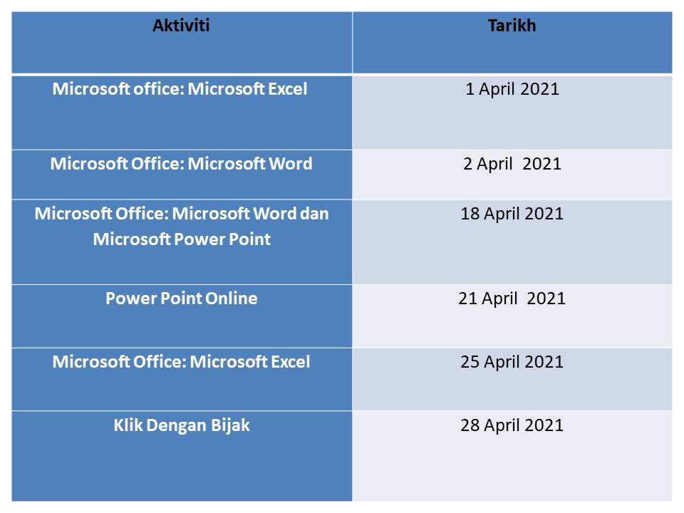 Tarikh : 21 April 2021 Masa : 9.00 hingga 11.00 pagi Lokasi : Bilik Latihan ICT Pusat Internet Komuniti Merapok Peserta : 1 orang Tujuan Mempelajari cara menggunakan Power Point Online bagi kegunaan tugasan […]